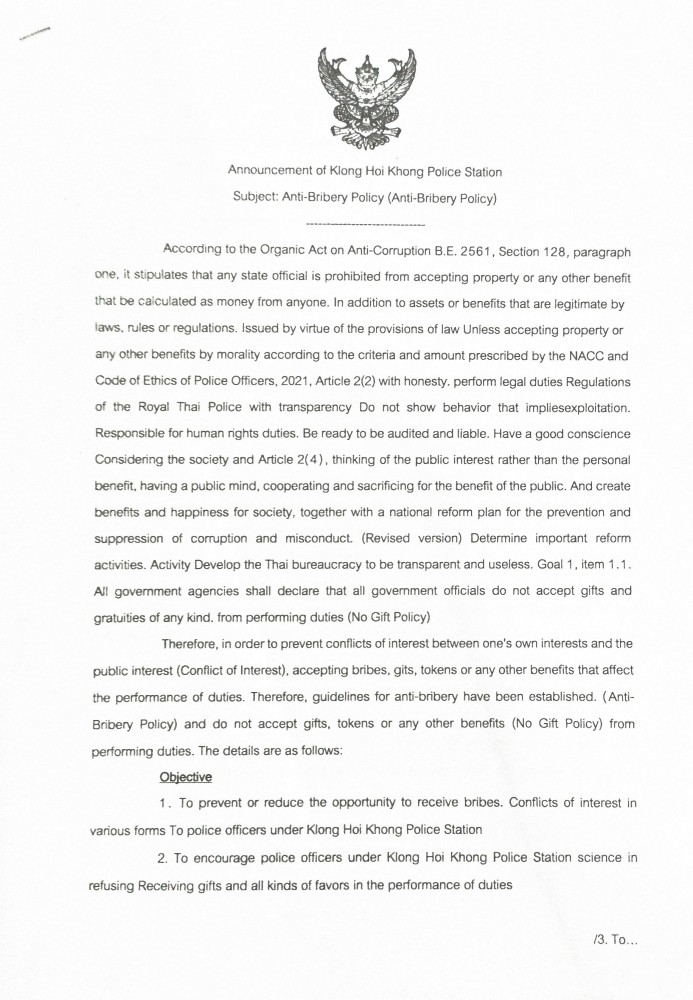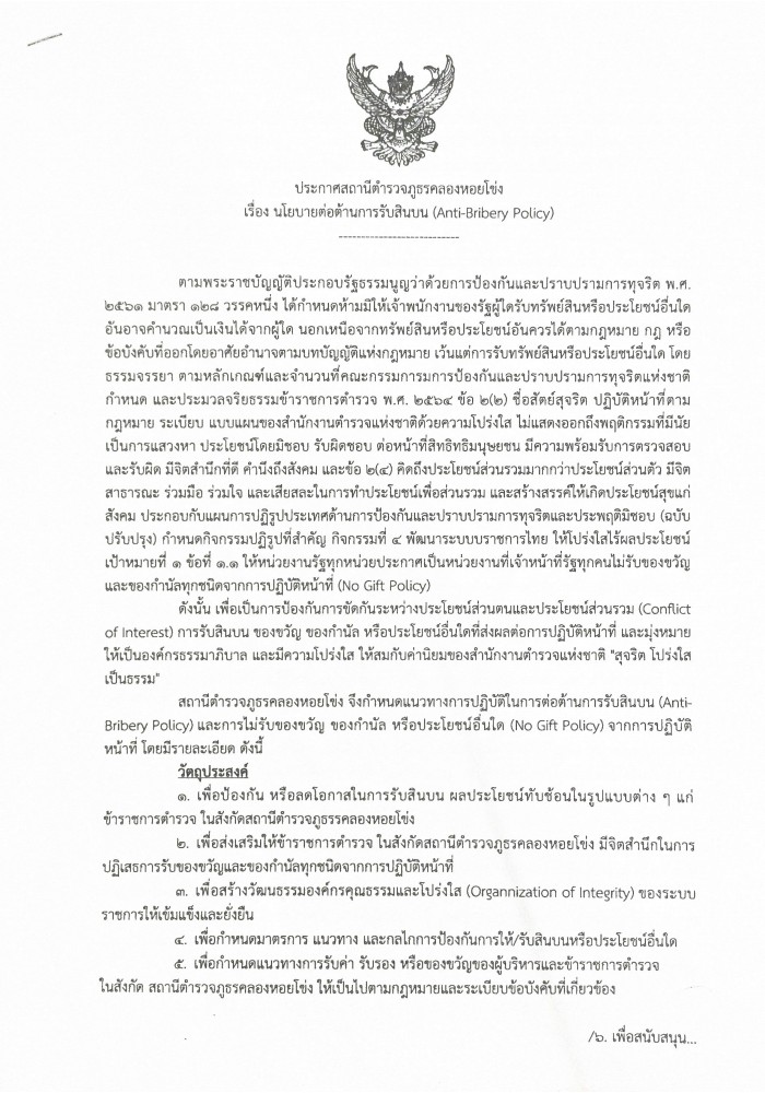 O18 ประกาศนโยบายต่อต้านการรับสินบน (Anti-Bribery Policy)